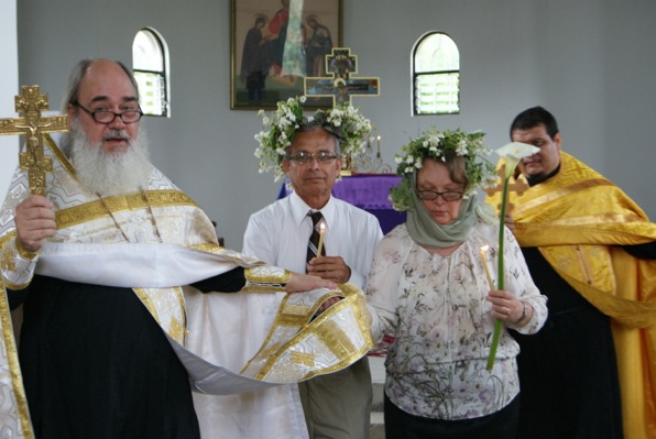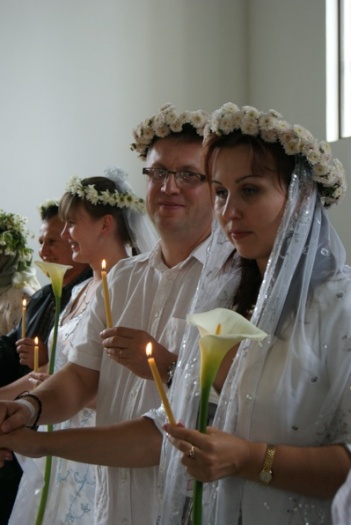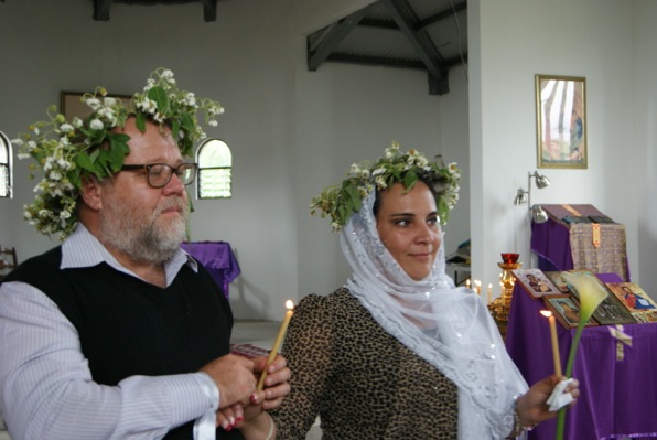 После обильной трапезы по благословению Владыки Митрополита Илариона, состоялось венчание четырёх пар. Люди, которые обратились за советом к о.Сергию по разным причинам, приняли решение венчаться в воскресенье после Божественной Литургии. Сначала это были только две пары, в субботу к ним присоединилась ещё одна, а в воскресенье к трём присоединилась и четвёртая к огромной и прямо детской радости о.Сергия. Владыка Митрополит благословил венчание в пост, так как эти люди давно живут в гражданском браке. Венцов у нас в храме нет, плели венки из цветов всем миром, как в большой и дружной семье.