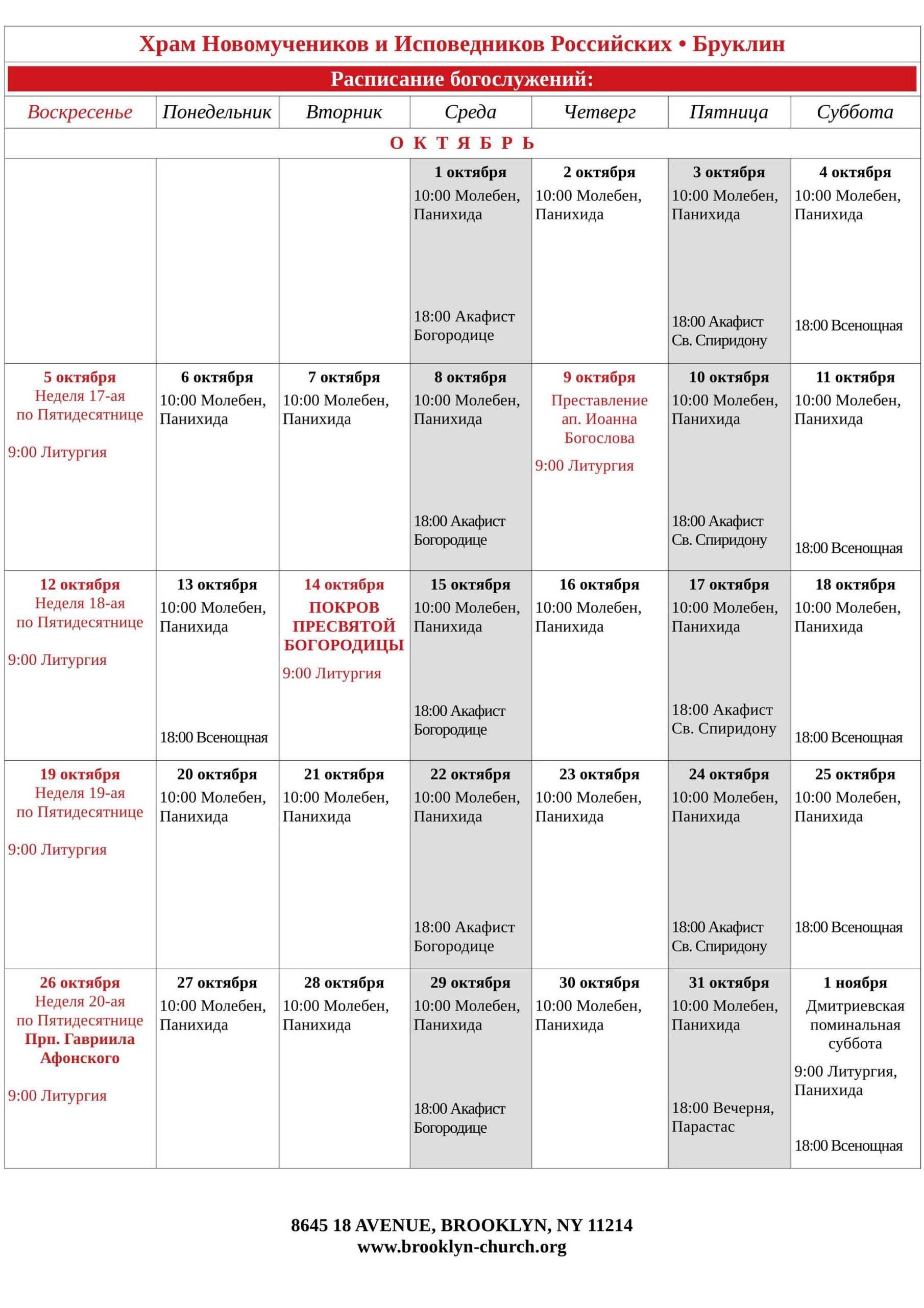 Расписание Богослужений на Октябрь, 2025
